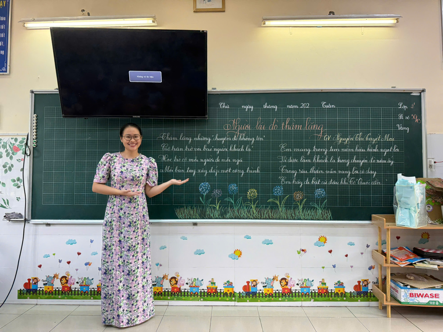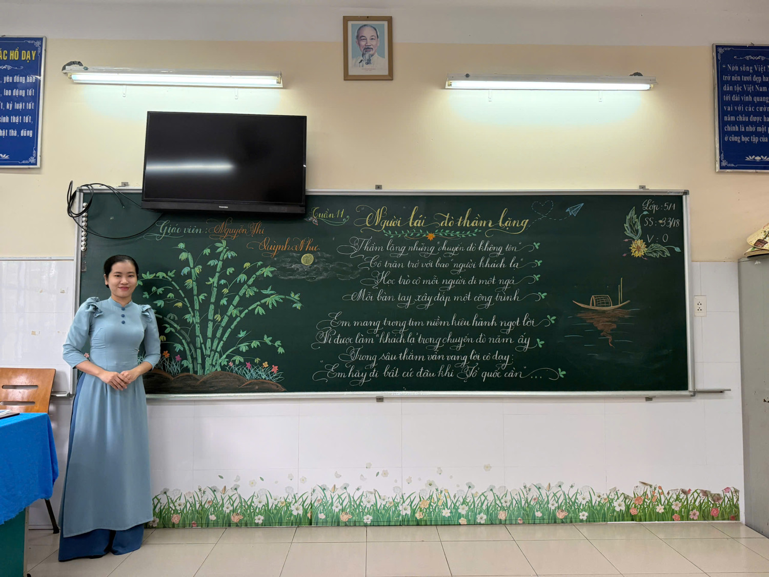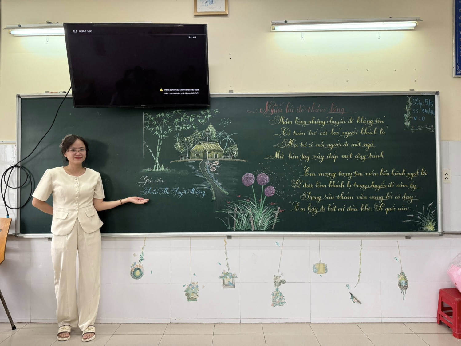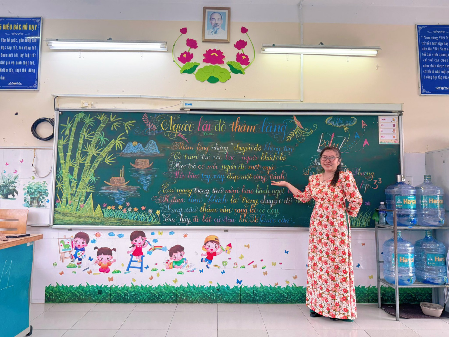 Hình ảnh cô giáo tự tin đứng bên bảng, giới thiệu phần thi của mình với nụ cười rạng rỡ đã góp phần lan tỏa tinh thần tích cực của hội thi. Nét chữ được trình bày ngay ngắn, hài hòa, bố cục bảng vở đẹp mắt cùng những hình vẽ trang trí tinh tế đã tạo ấn tượng mạnh cho người xem.
