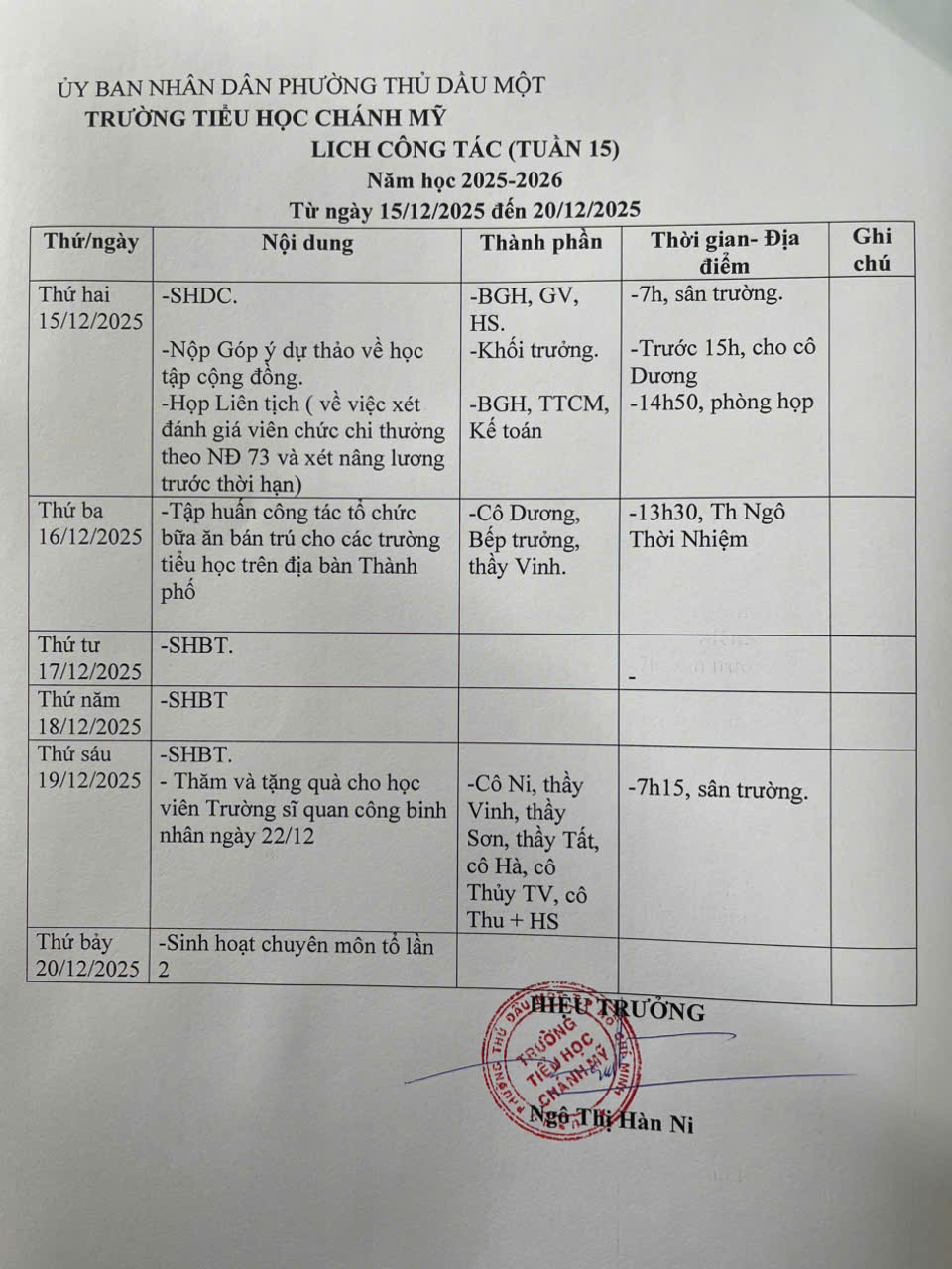 Lịch làm việc tuần 15 ( Từ 15/12 đến 19/12)