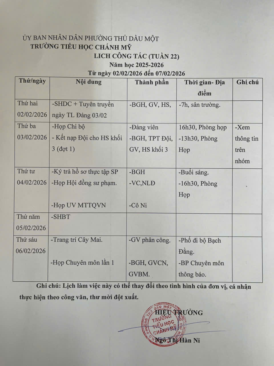 Lịch làm việc tuần 22 ( Từ02/02/2026 đến 06/02/2026)