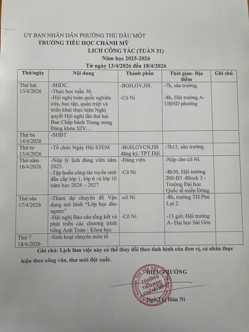 Lịch làm việc tuần 31 ( Từ 13/4/2026 đến 17/4/2026)