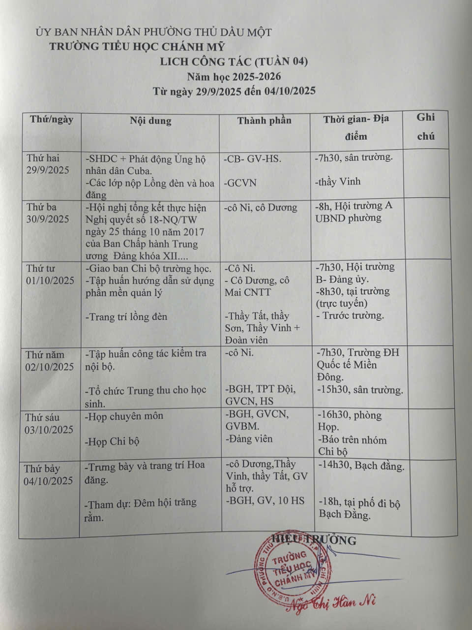 Lịch làm việc tuần 4( Từ 29/9/2025- 04/10/2025)