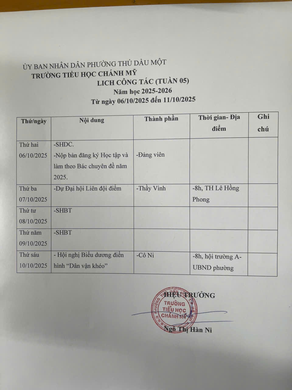 Lịch làm việc tuần 5( Từ 06/10/2025- 10/10/2025)