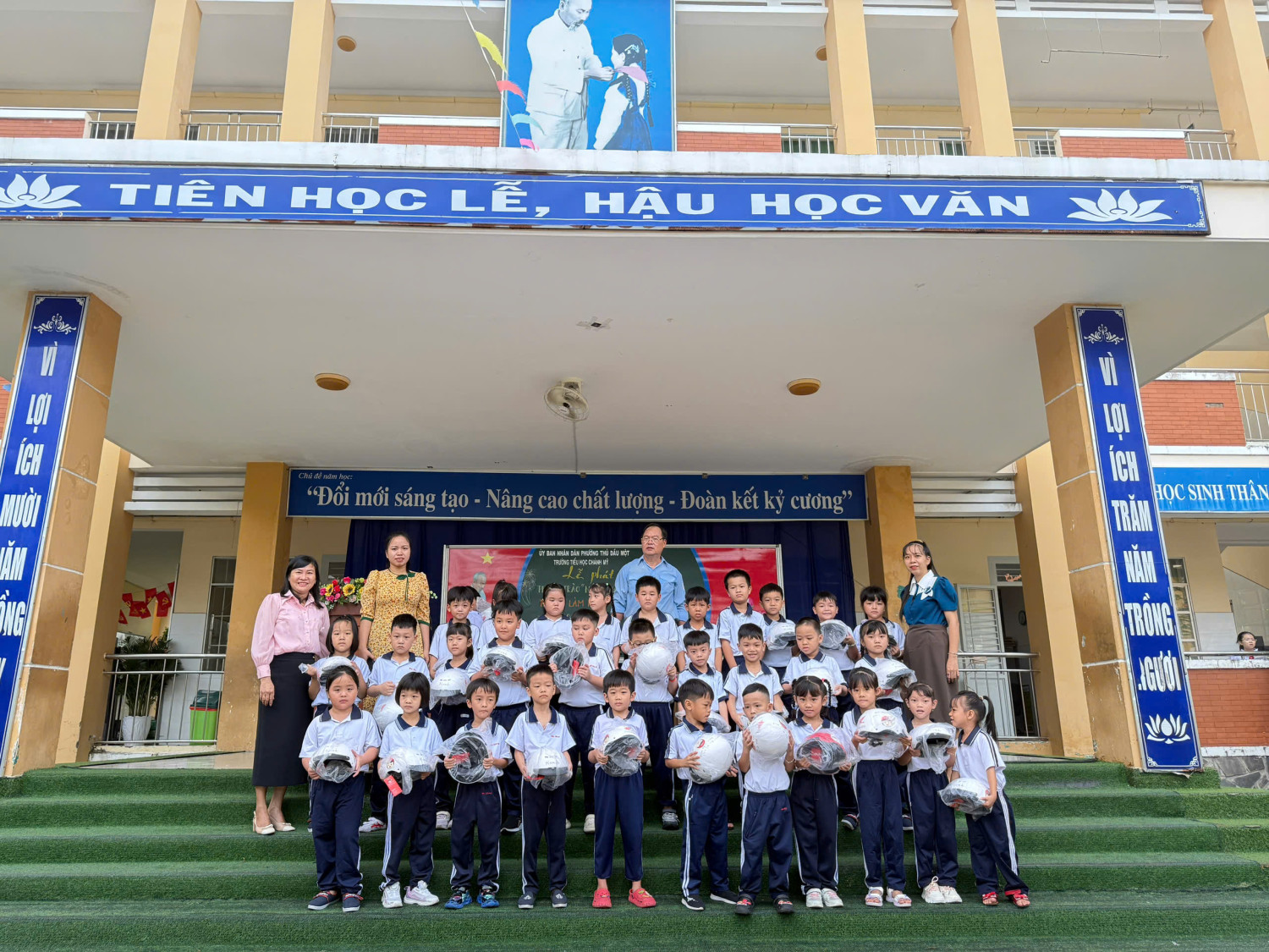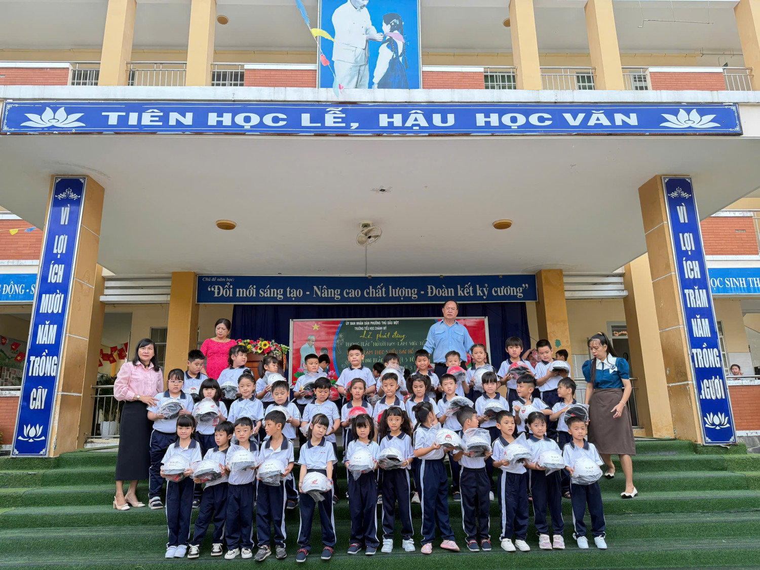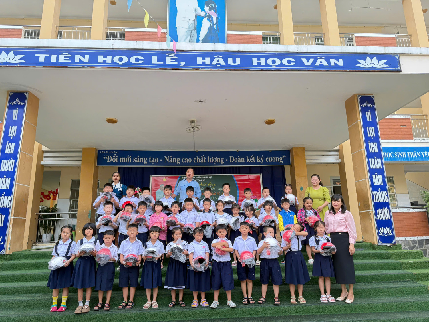 Trong buổi sáng cùng ngày nhà trường đã phối hợp công ty HONDA đã trao nón bảo hiểm cho 184 học sinh lớp 1. Tuyên truyền nhắc nhở HS khi tham gia giao thông ngôi trên Mô tô phải đội nón bảo hiểm ……