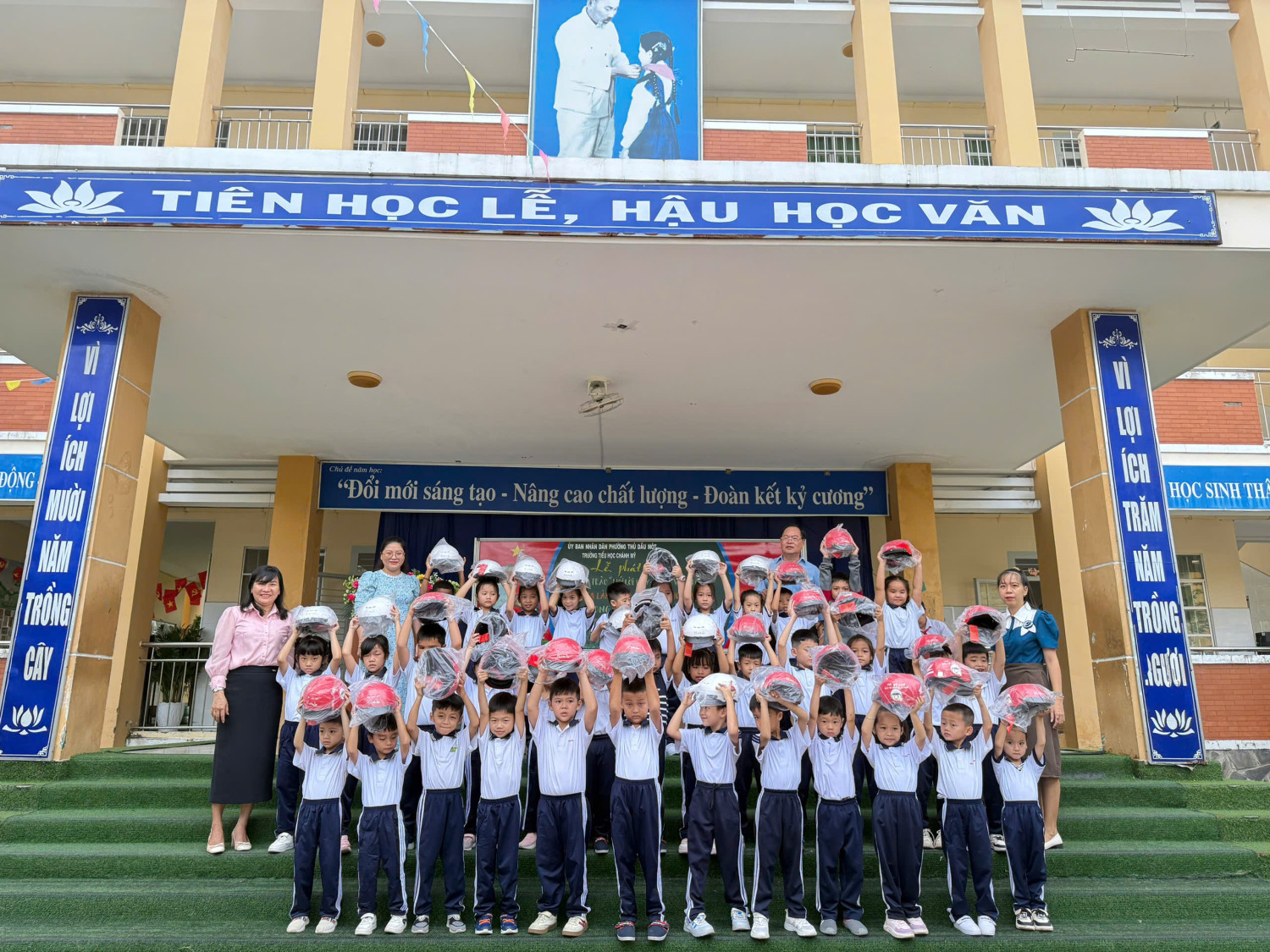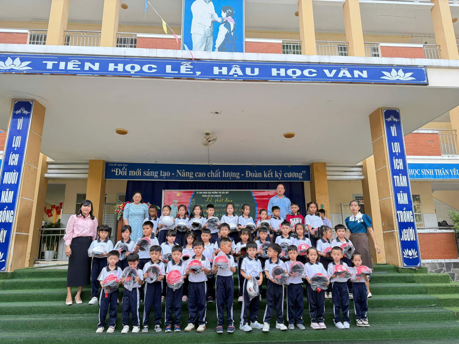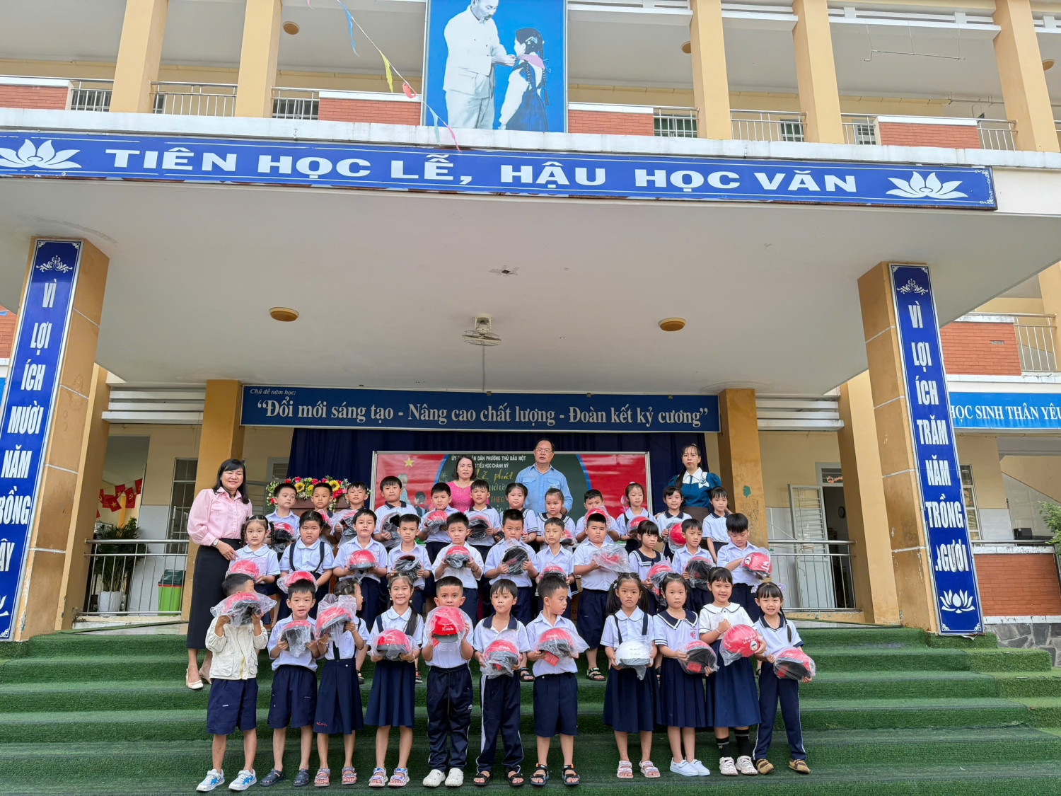Trong buổi sáng cùng ngày nhà trường đã phối hợp công ty HONDA đã trao nón bảo hiểm cho 184 học sinh lớp 1. Tuyên truyền nhắc nhở HS khi tham gia giao thông ngôi trên Mô tô phải đội nón bảo hiểm ……