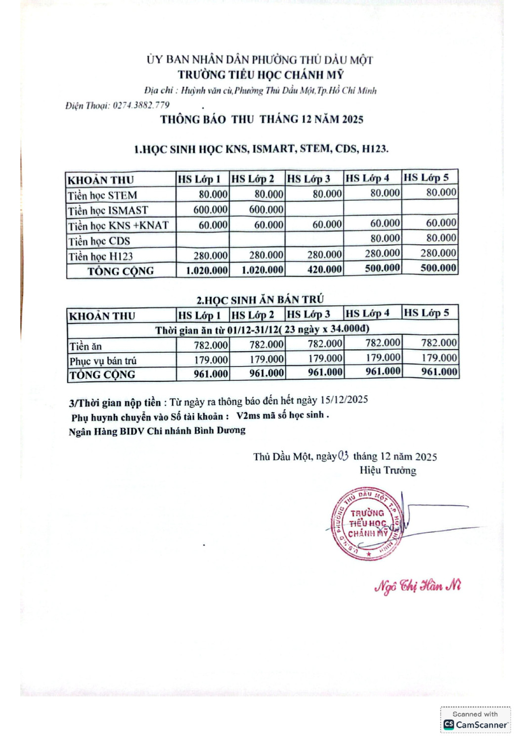 Thông Báo Thu Tiền Bán Trú Tháng 12/2025