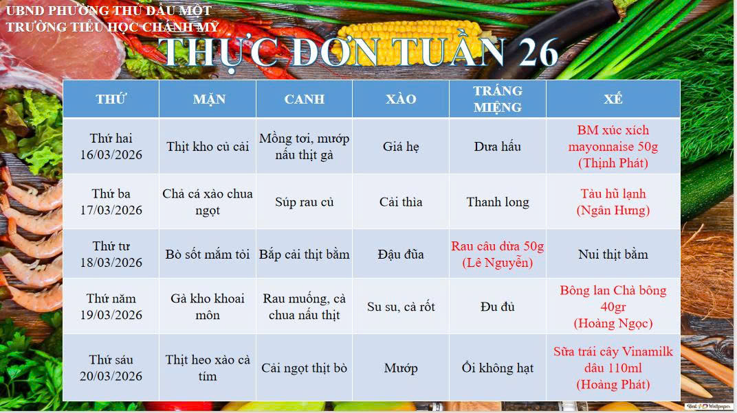 Thực đơn tuần 26( Từ 16/3/2026 đến 21/3/2026)