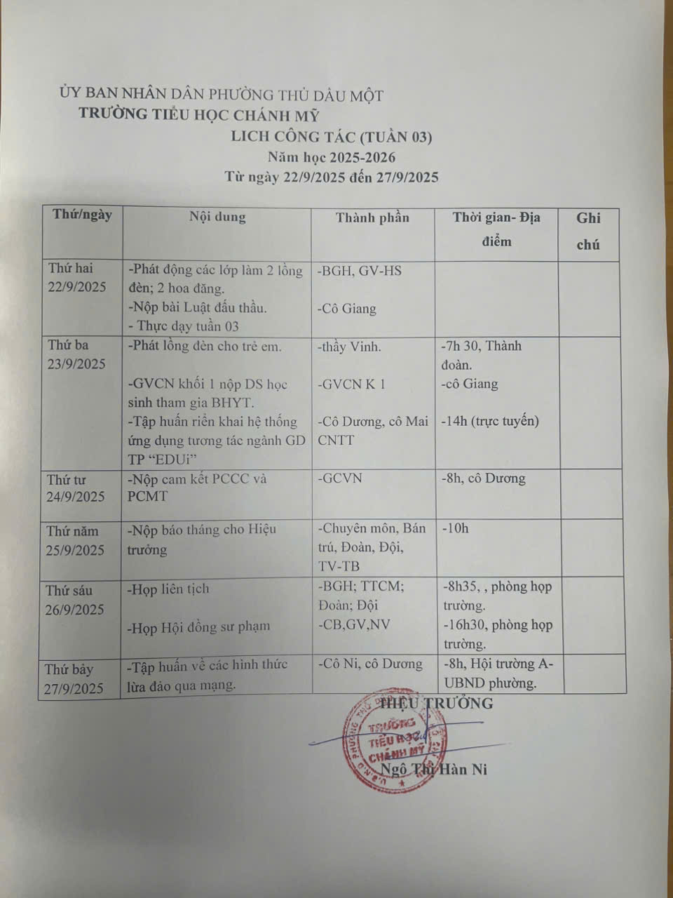 Lịch làm việc tuần 3( Từ 22/9/2025- 27/9/2025)